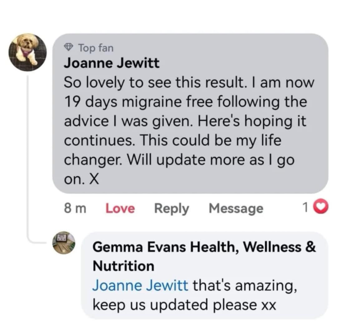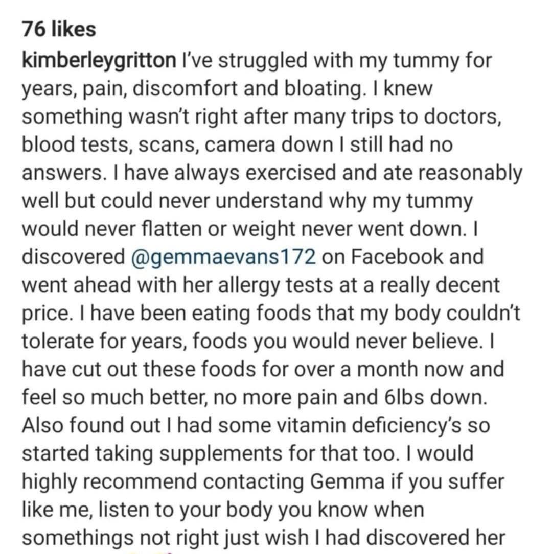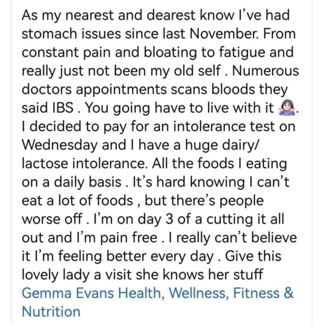 Are you still skeptical about Gemma’s Intolerance Testing Services? Check out these genuine testimonials linked back to Facebook that showcase the real impact she’s had on transforming lives.